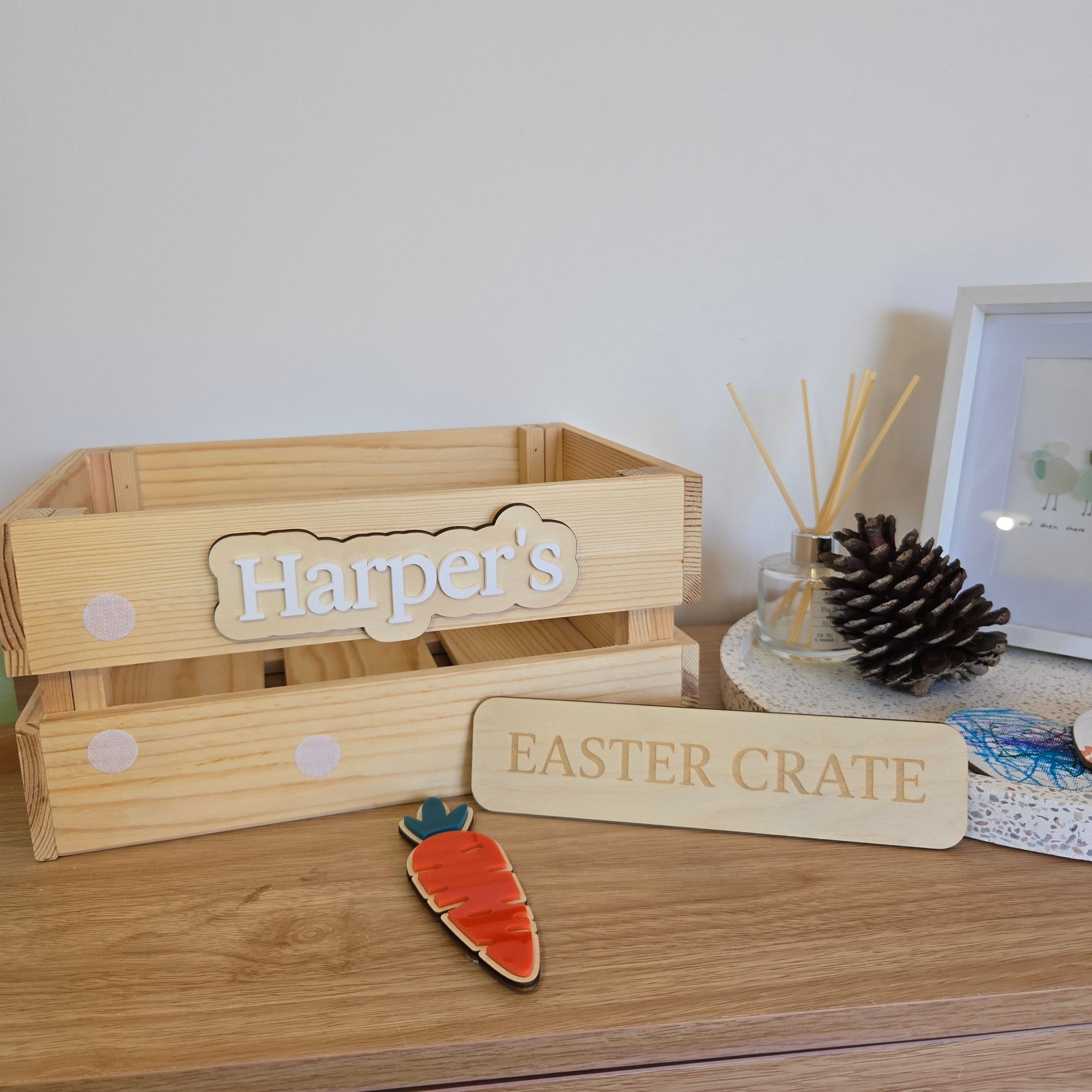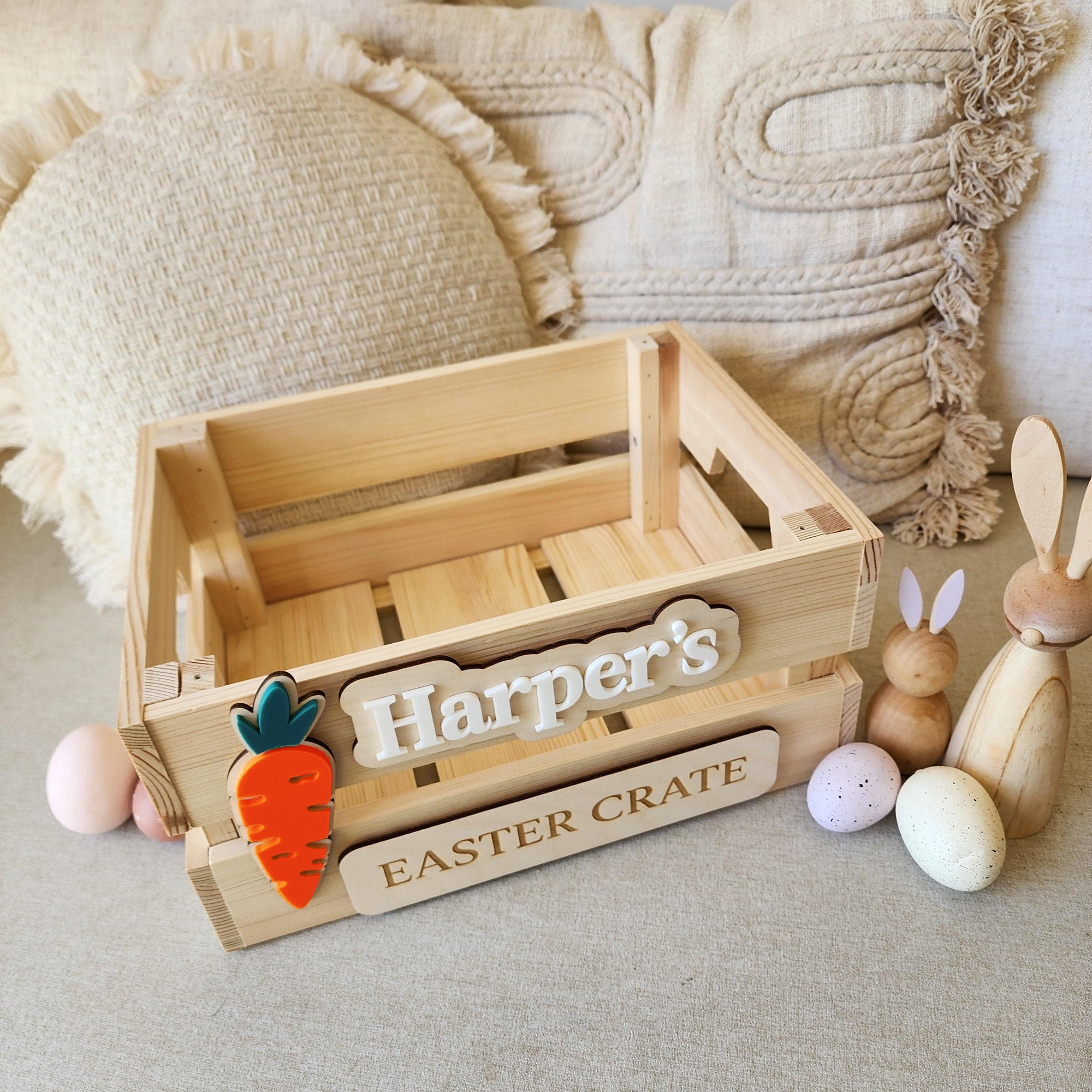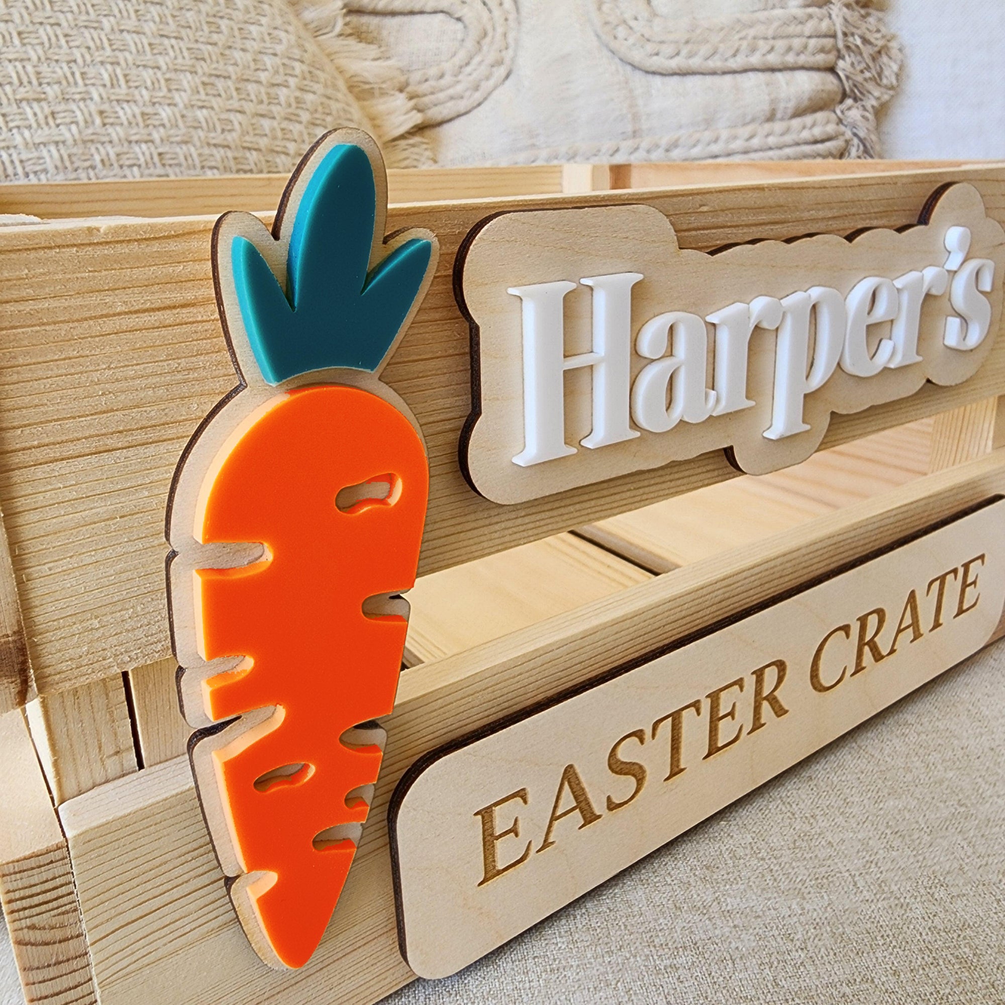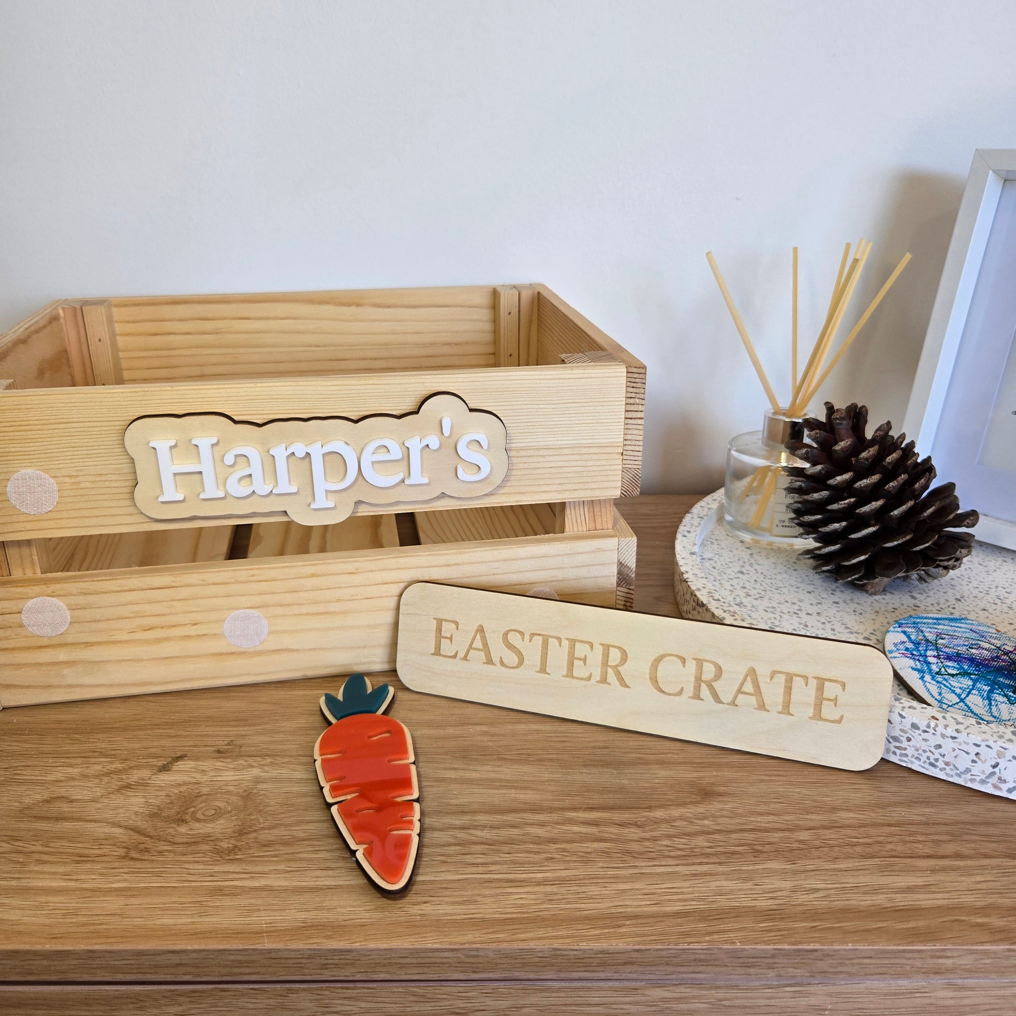 Personalised Wooden Easter Crate with 3D Carrot Tag - Interchangeable Easter Day Keepsake Basket Box
