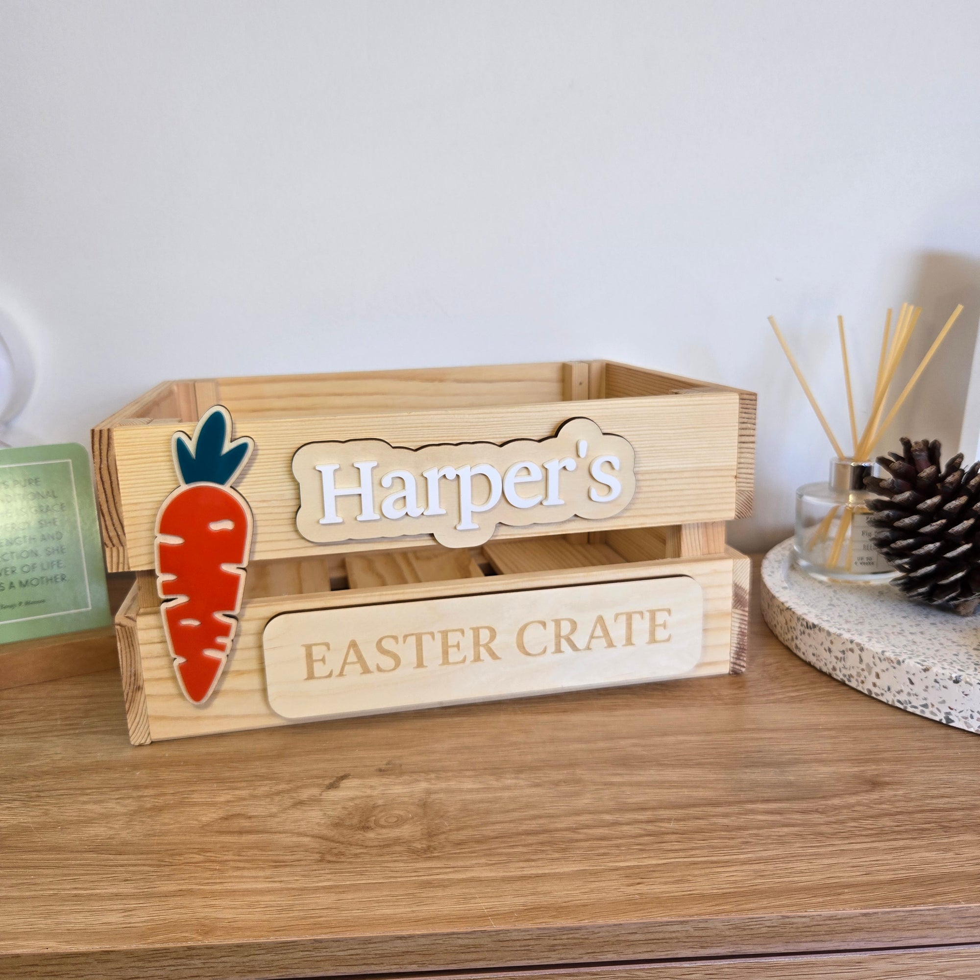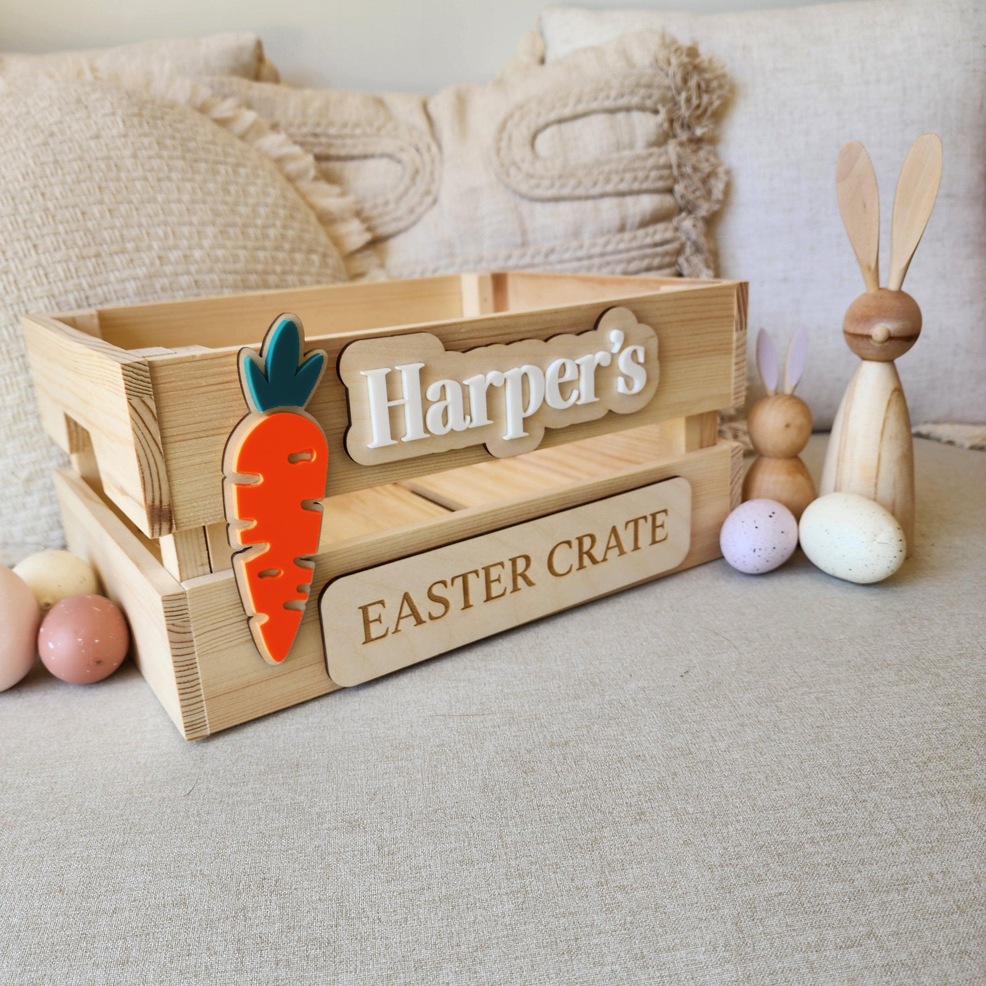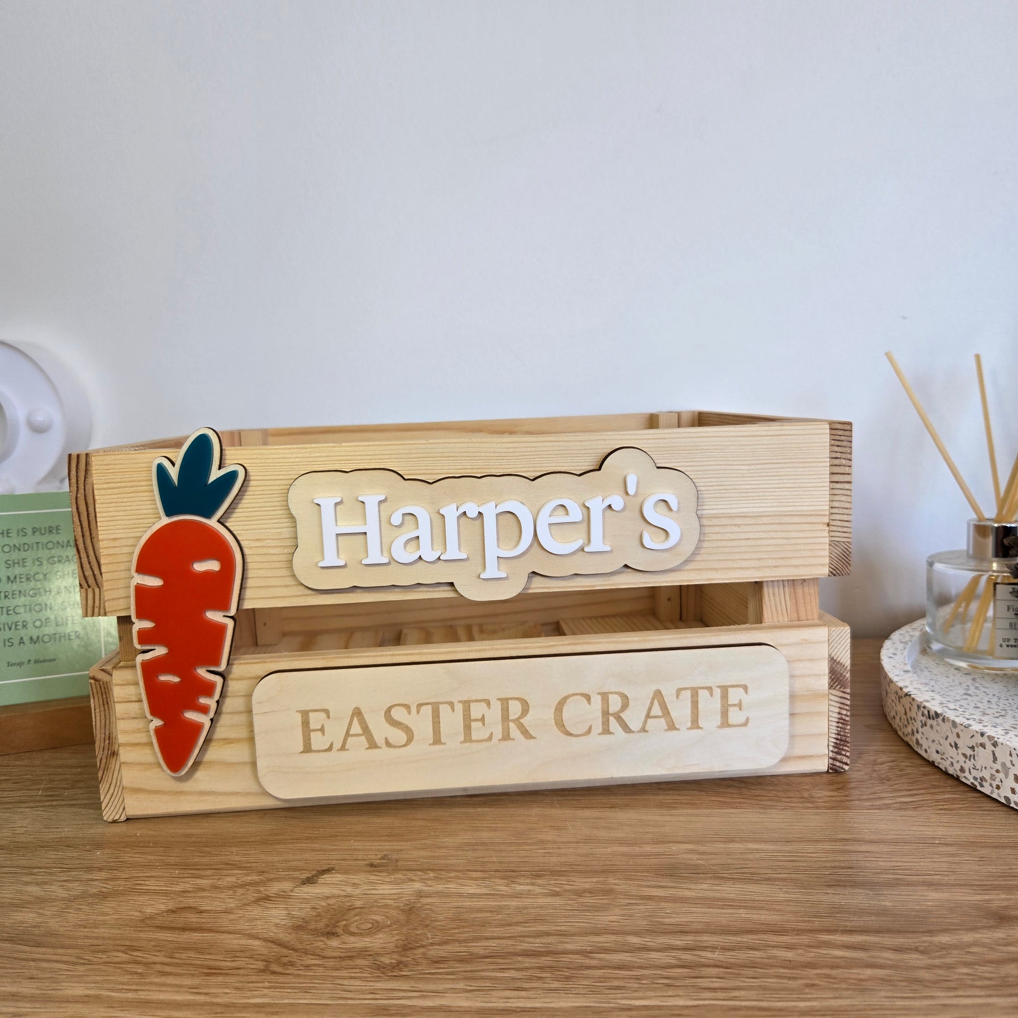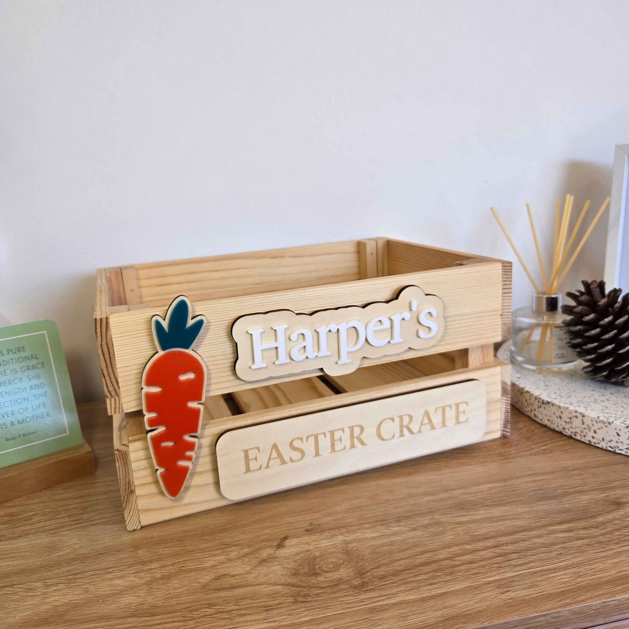 Personalised Wooden Easter Crate with 3D Carrot Tag - Interchangeable Easter Day Keepsake Basket Box