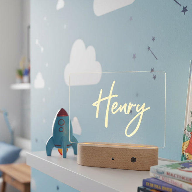 Customise your night light with a name of your choice, making it the perfect gift for a child or loved one. The high-quality acrylic plaque and solid wood base ensure that your night light will last for years to come, providing a comforting and safe atmosphere to fall asleep in each night.
